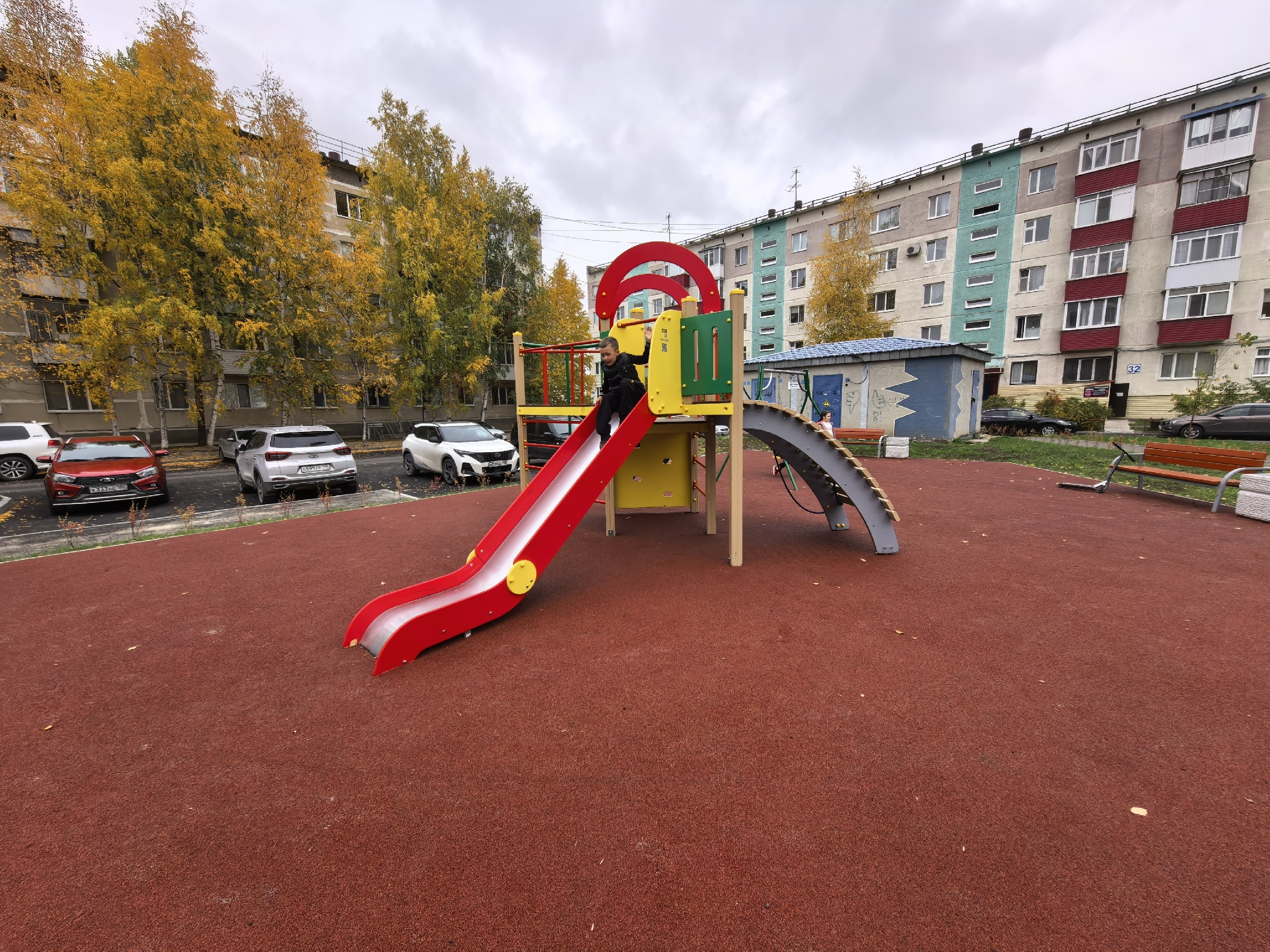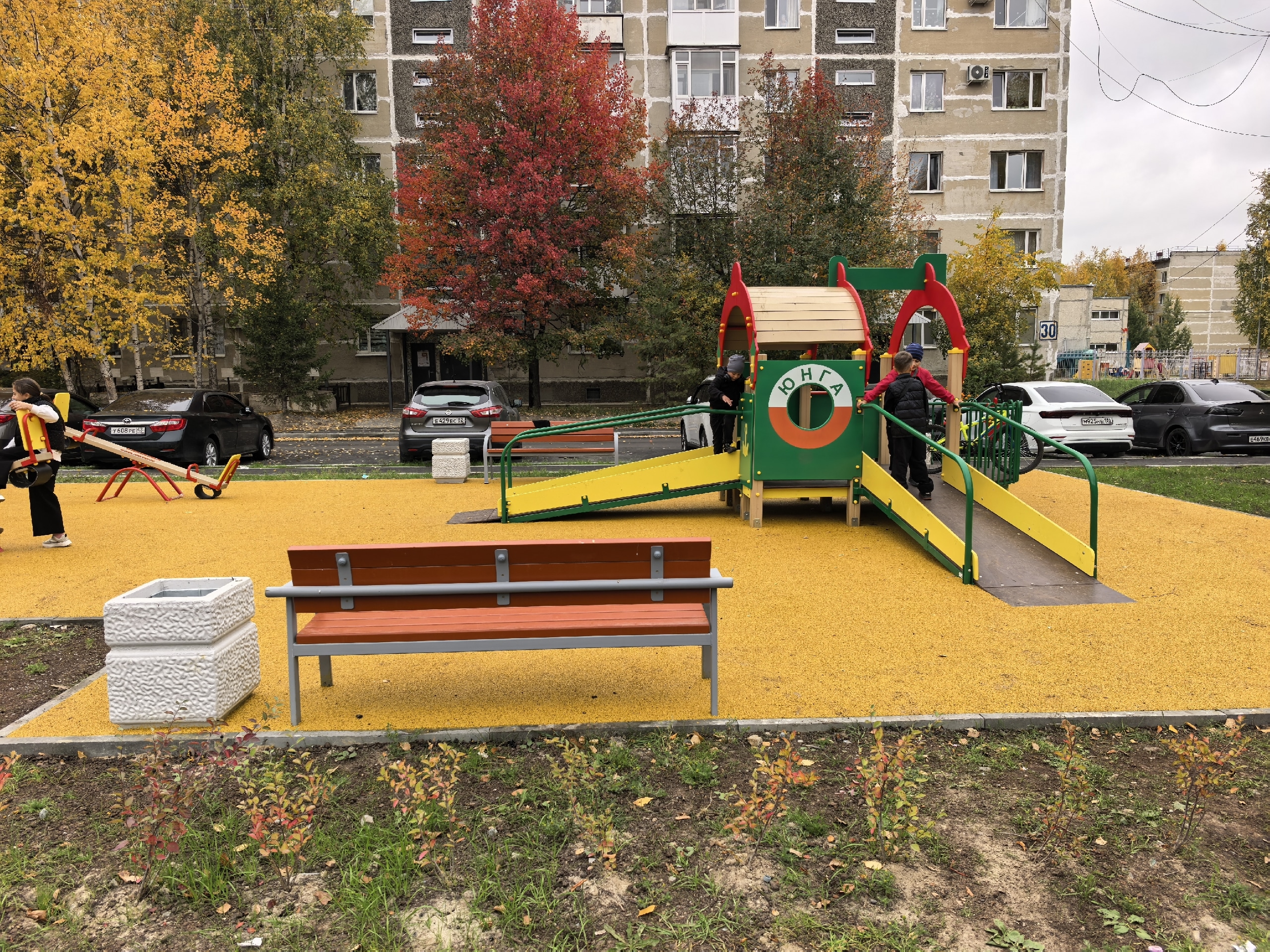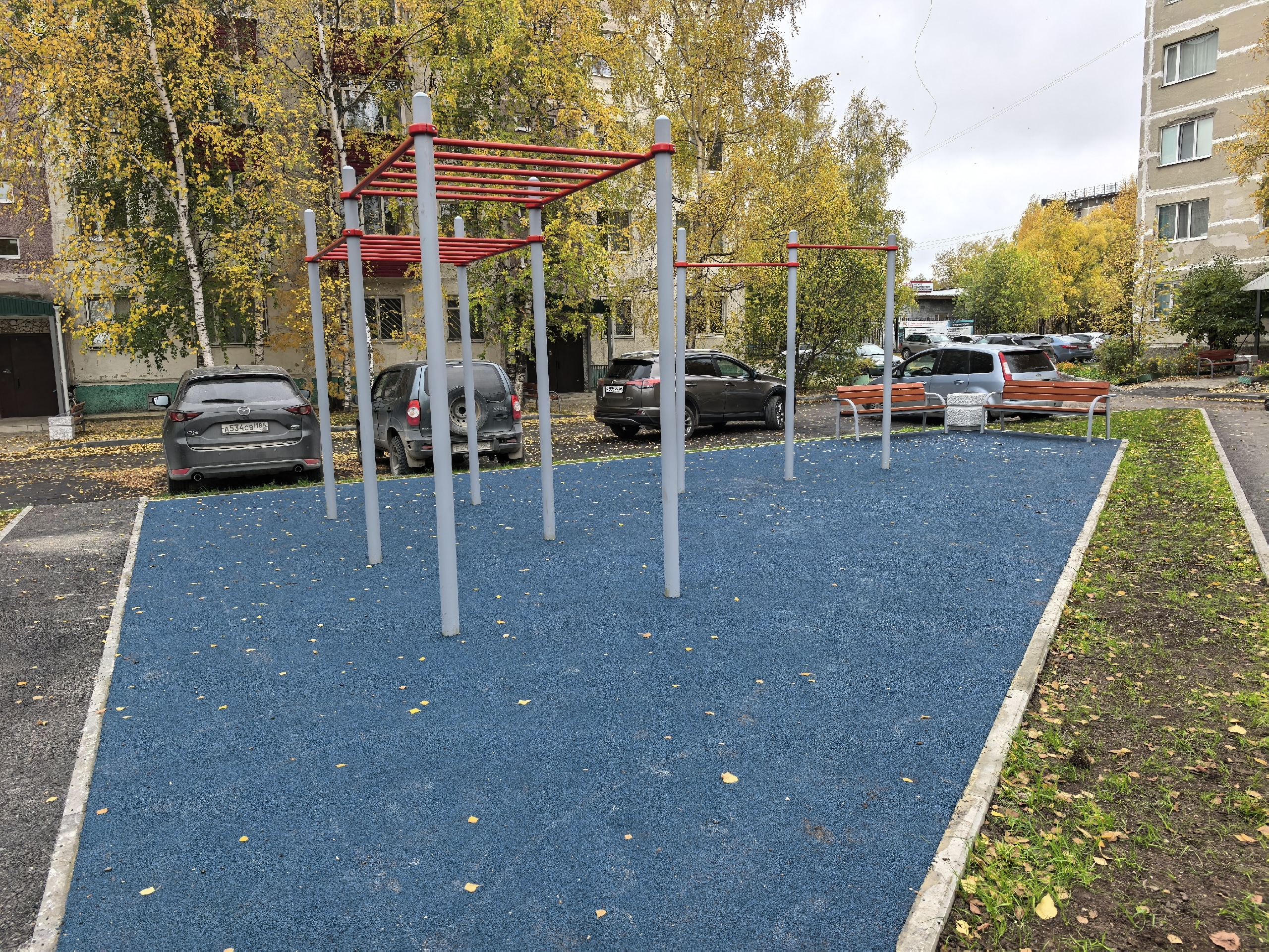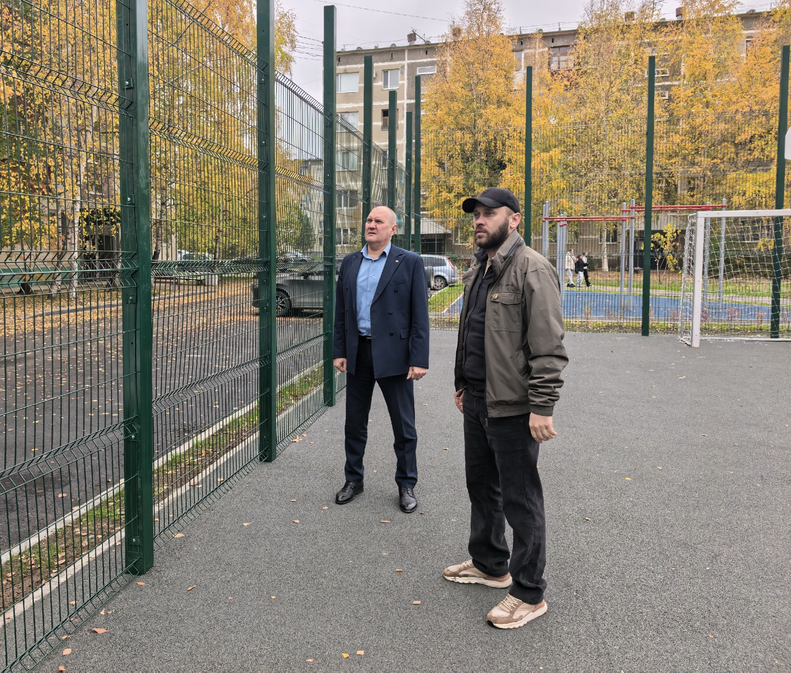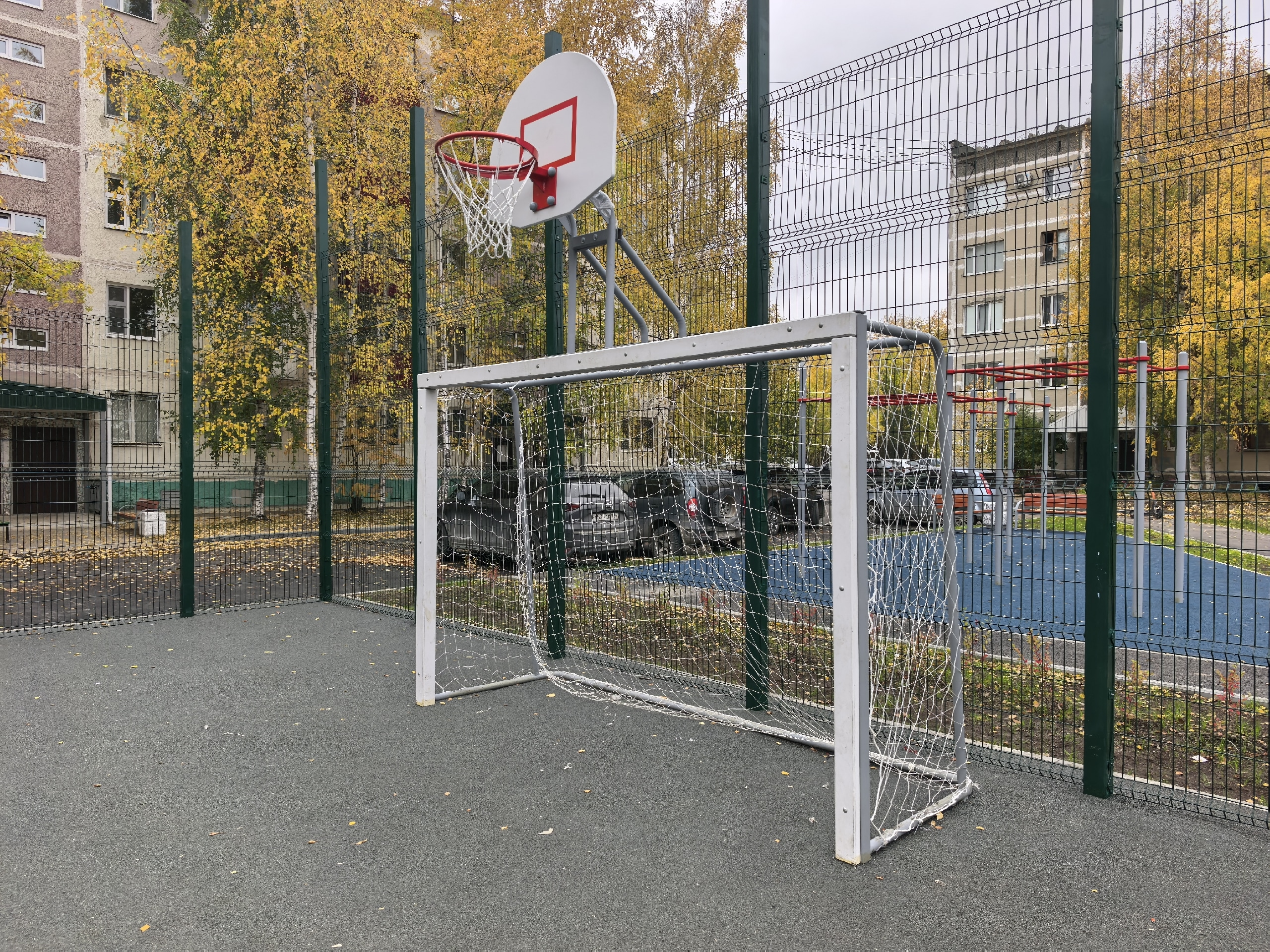 В настоящее время здесь завершены все необходимые работы: уложено дорожное покрытие, установлены малые архитектурные формы и баскетбольные щиты, смонтированы турники. Выполнено ограждение спортплощадки с устройством ворот. Кроме того, за счет подрядчика обустроен тротуар вдоль домов № 30, 31, 32 и 33.