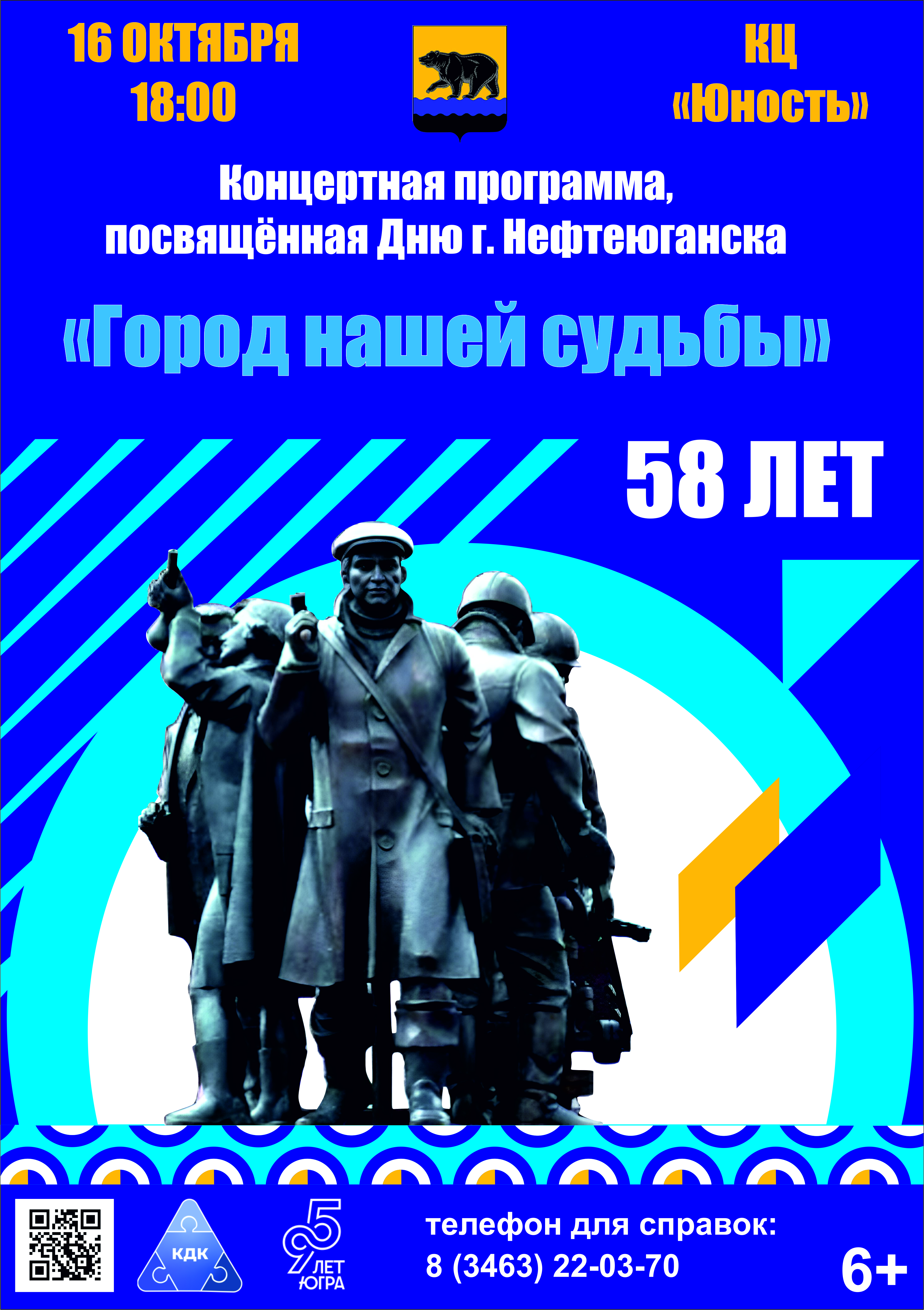 Приглашаем на концертную программу «Город нашей судьбы» в честь 58-й годовщины со дня образования города Нефтеюганска. Мероприятие состоится в Культурном центре «Юность» 16 октября 2025 года в 18.00.